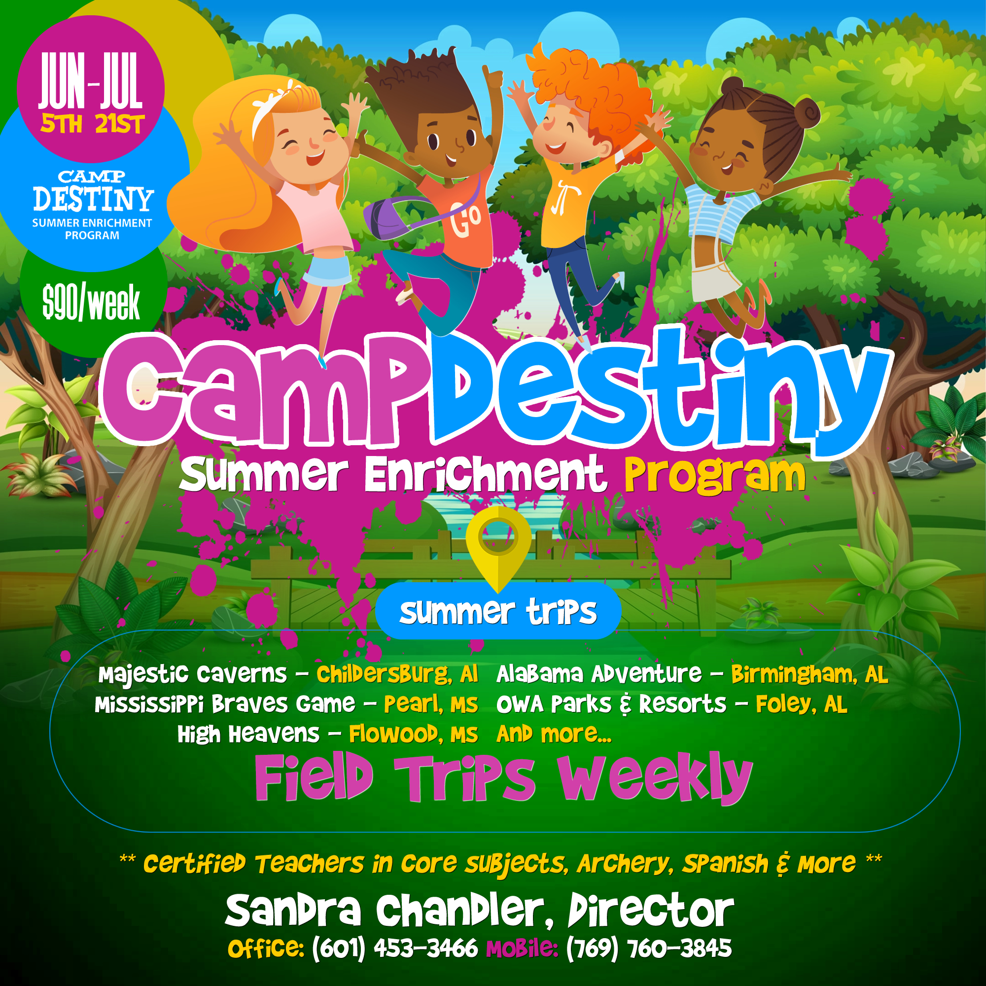 Welcome to Camp Destiny's Learning Neighborhood! Camp Destiny Summer Enrichment Program is an exciting faith-based community outreach program located in Meridian, Mississippi. Founded under the auspices of the non-profit organization New Destiny Urban Development Corporation, Camp Destiny is a collaborative effort between Freedom Rock Christian Fellowship Church and LaBaron Hedgemon Ministries. CLICK BELOW FOR MORE INFO |